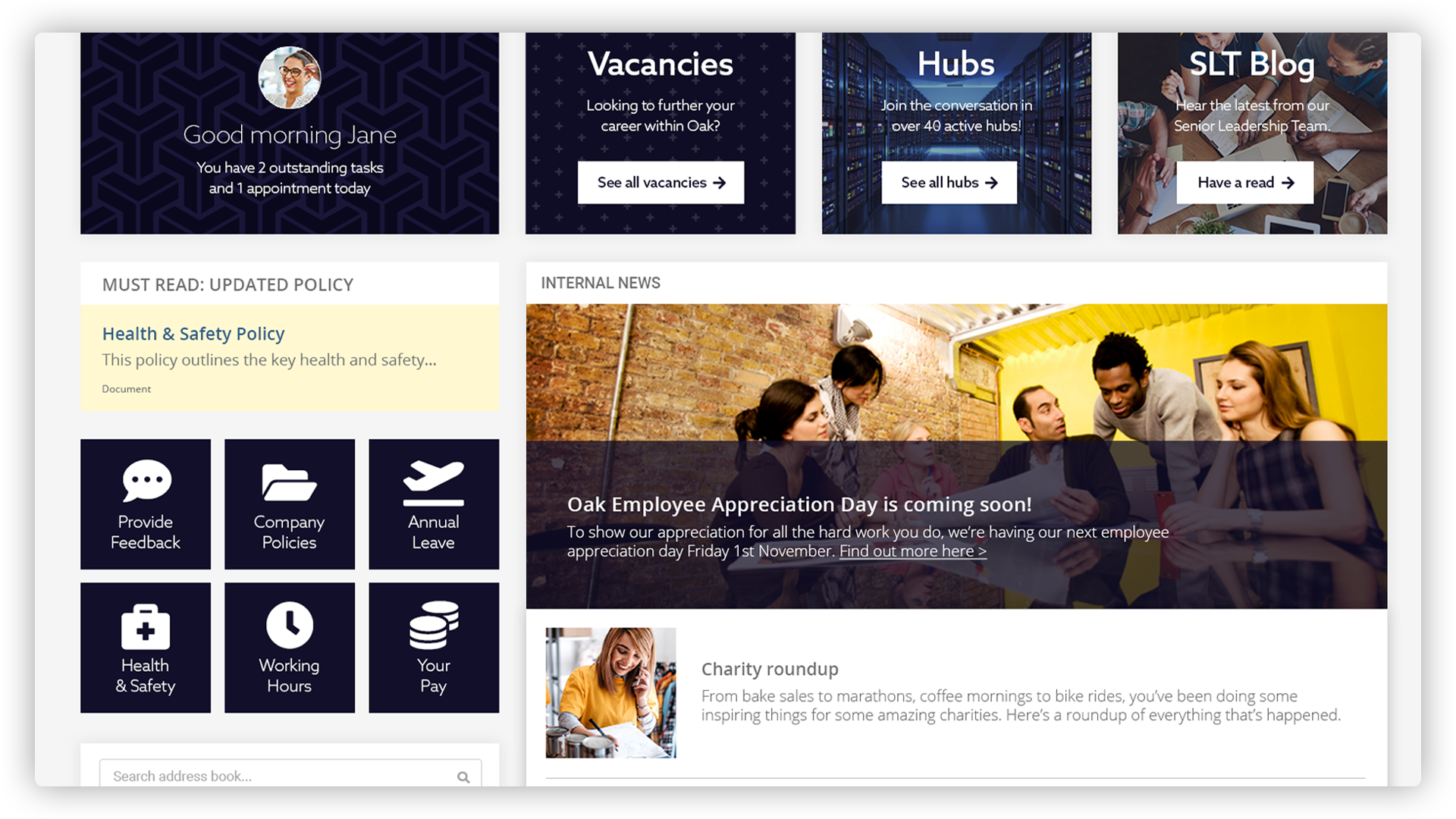 An area welcome feature personalises the digital workplace experience for all employees, reflecting the organisation’s company values and culture. By personalising a welcome message on your company homepage, you can show how much you value your employees, ultimately improving your employee retention across your organisation.