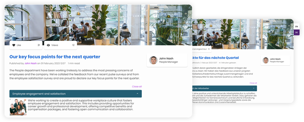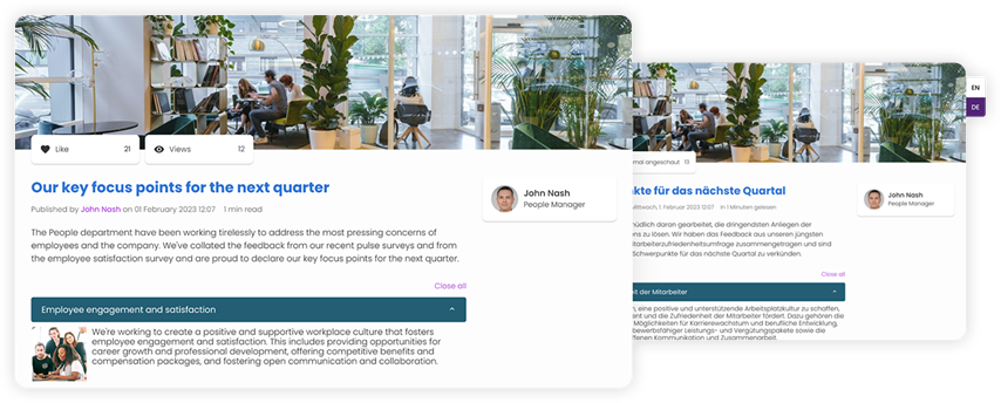 It’s important for a company intranet to make it quick and easy for employees to learn as much about their colleagues as possible. This feature helps onboarding new employees and supporting them in getting to know the company better. Employee profiles also help people get to know each other on a more personal level and makes it easier for management to get answers to questions they may have about an employee's activities in the virtual workspace.