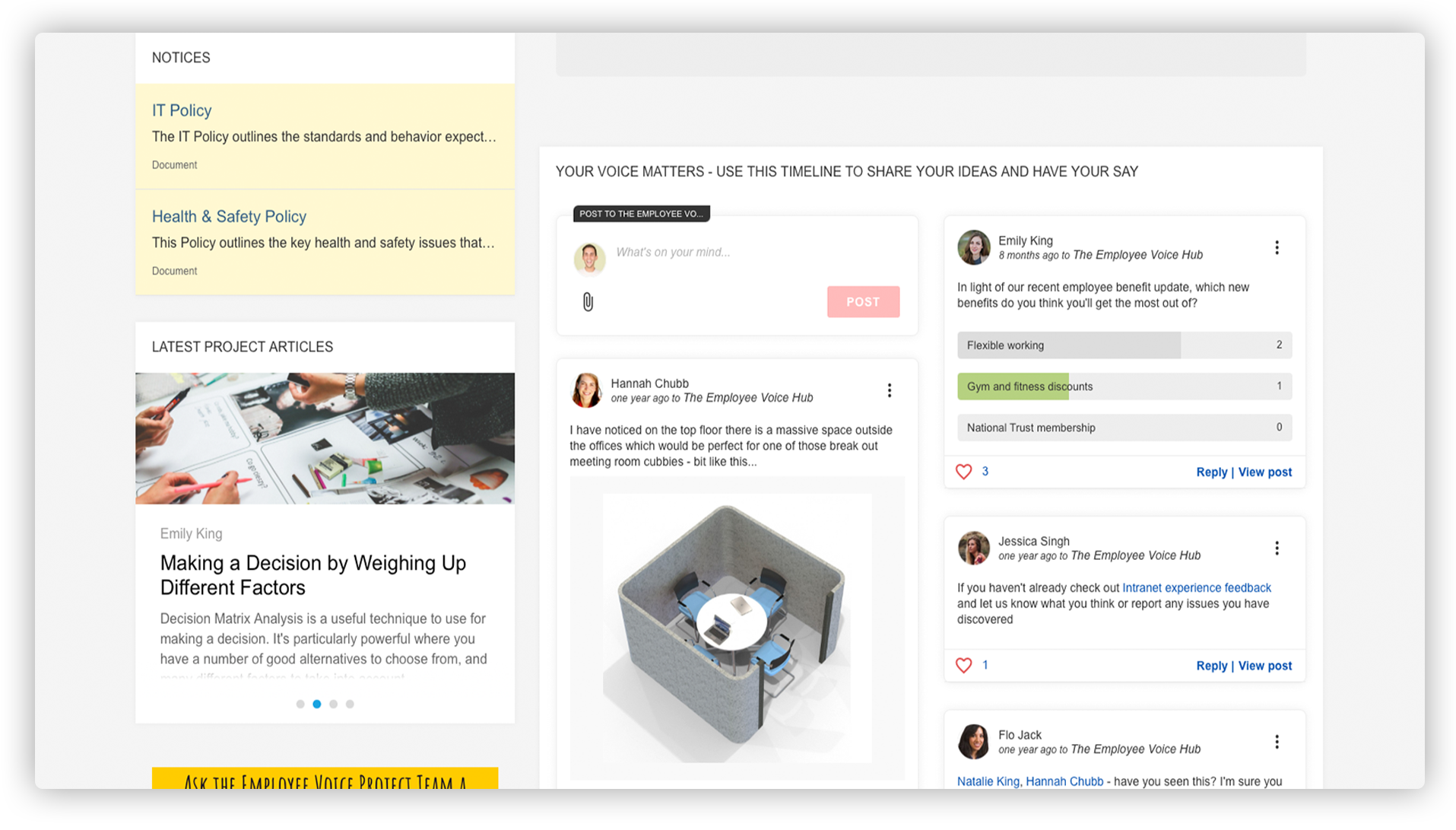 A poll is designed as a collaborative tool to increase employee engagement, productivity and efficiency. Companies no longer have to gather information by email, but can start a poll on their intranet, it may be used to get an understanding of what your people want, involve more employees in conversations or leverage a poll to generate content. By targeting specific employees, polls can generate data or content that could be reused.