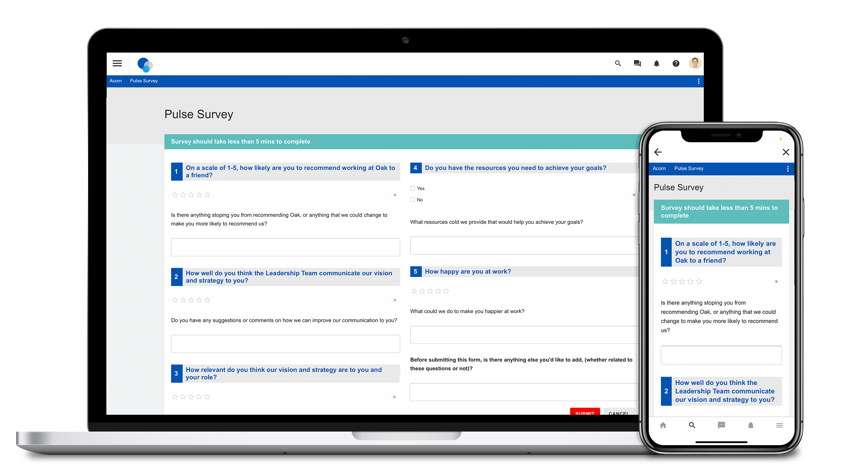 Pulse Surveys are used to gather real, actionable insights that businesses can use to improve employee engagement, collaboration and enhance employee experience. They also allow your business to gauge interest, understand an employees opinion, gather feedback and more. Oak surveys are a versatile tool that gives you everything you need to get valuable data from employees, all within your company intranet.
