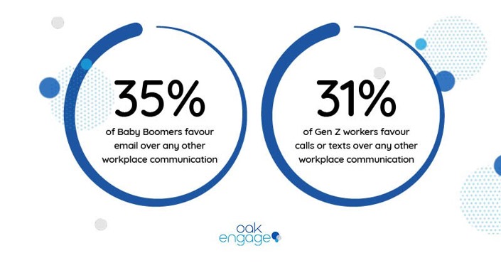 The typical modern workforce is diverse and as such you must devise a strategy that will engage with everyone. 35% of baby boomers prefer email as a means of communication in the workplace, compared to 31 % of Gen Z workers who favour text or calls.