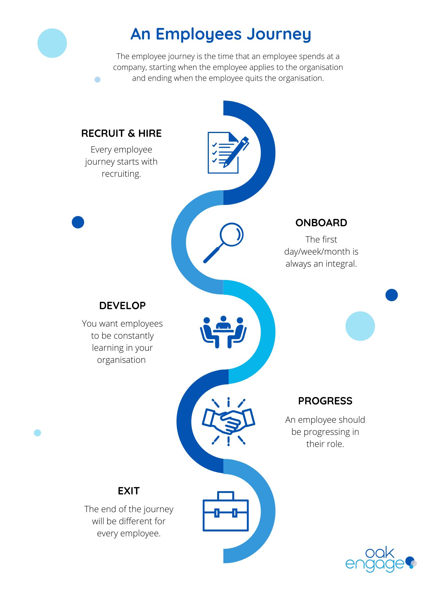 The employee journey is the time that an employee spends at a company, starting when the employee applies to the organisation and ending when the employee quits the organisation.