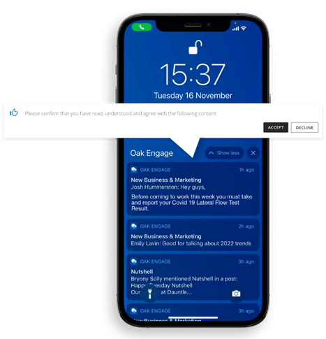 Do you have a piece of news that your employees absolutely must read? Oak’s mandatory read feature pushes notifications to all employees that instruct them to read important news and content immediately.