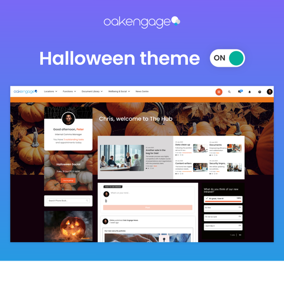 Employee recognition: Halloween is a time to celebrate creativity and teamwork. Use Oak Engage's recognition tools to acknowledge employees who put in extra effort for Halloween-themed office decor or costumes. Highlight their contributions on the intranet to boost morale.