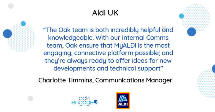 Aldi: Aldi were on the search for a tool to revolutionise their communication. Oak helped them launch their intranet app for desktop and mobile ‘MyAldi’.