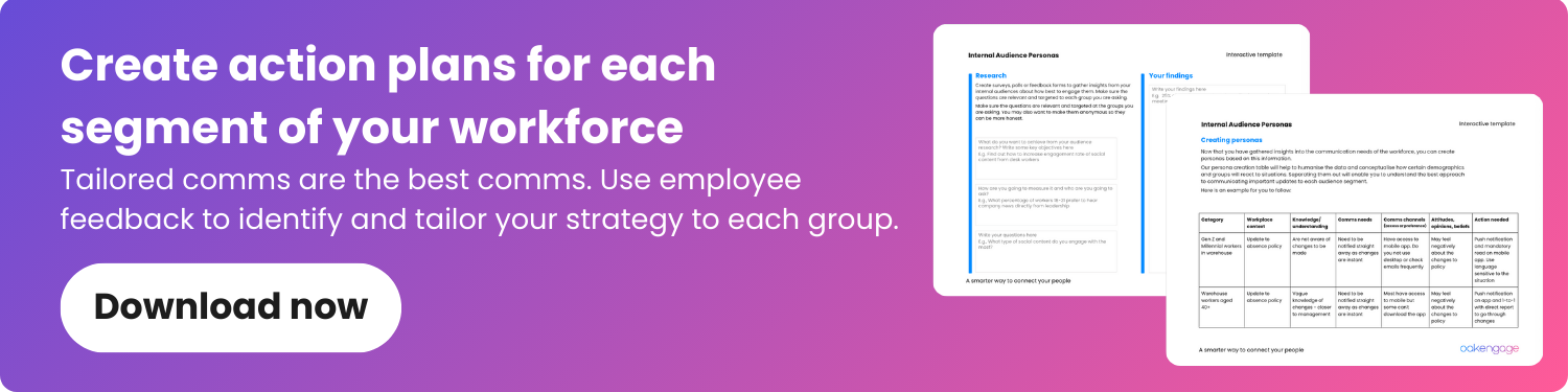 When you’ve listened to the employee feedback, you’ll identify what each group within the workforce has or requires, which will help you to tailor your approach accordingly. Use our internal audience persona template to guide you through the improvements based on feedback from each employee type across the organisation.