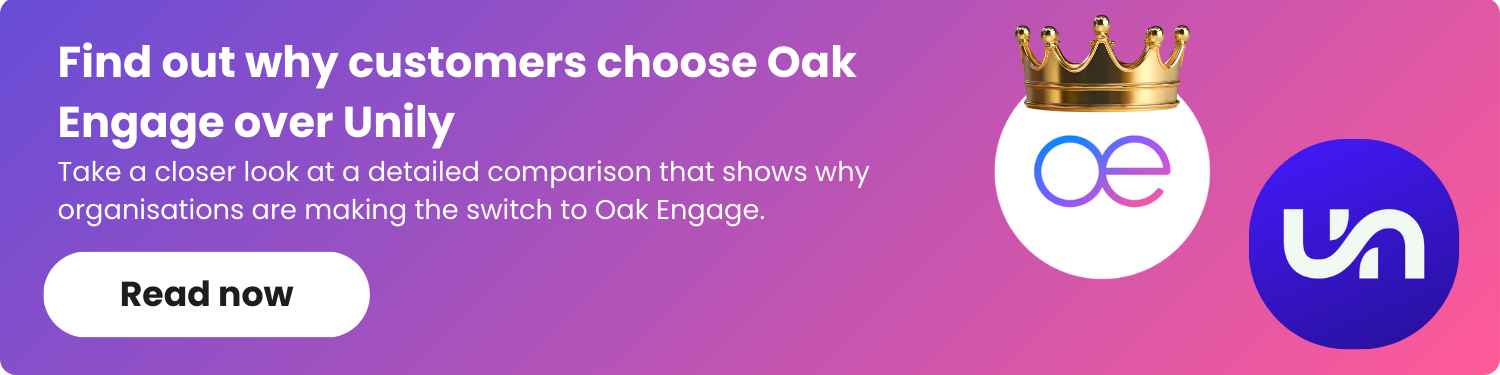Oak Engage earns the top spot as the strongest Unily alternative for organisations needing a more modern, intuitive and mobile-first intranet experience. While Unily excels in enterprise customisation and depth, Oak’s advantage lies in offering that same level of structure — but with far less complexity and far greater accessibility for hybrid and frontline workforces. Oak is designed for real-world organisational needs: fast communication, targeted content delivery, mobile reliability and easy management without large IT involvement.