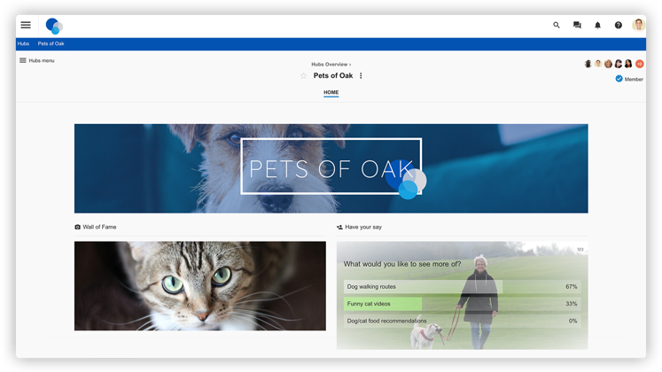 At Oak, hubs bring employees together, allowing them to share and collaborate on common interests. Whether you need to share content company-wide, share the latest user interface designs with a select group, or simply want a place to talk about the next social event. Hubs allow you to instantly connect and target the right people.